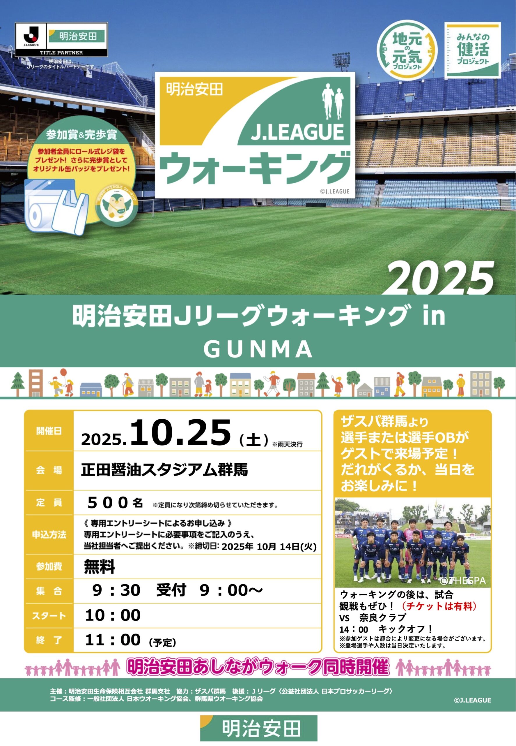 このたび、10月25日(土)に開催されます明治安田J3リーグ 第33節 奈良クラブ戦におきまして、ザスパ群馬 クラブゴールドパートナーの明治安田生命保険相互会社 群馬支社様による「2025明治安田Jリーグウォーキング in GUNMA」を開催いたします。