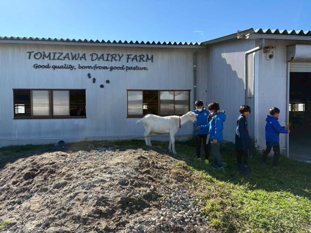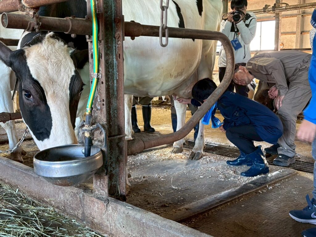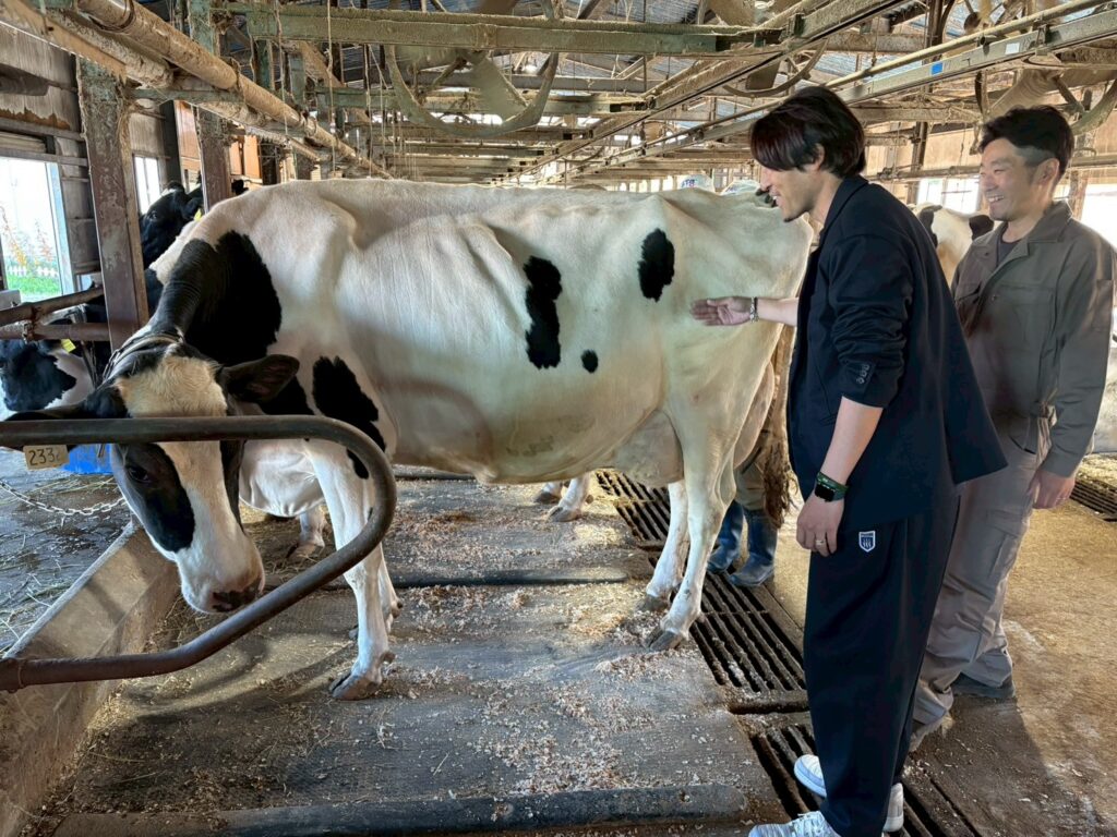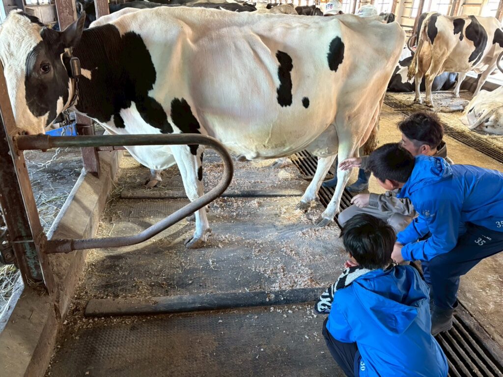 搾乳体験では、怖がる選手もいましたが、牧場主の富澤様に優しく教えていただき、全選手が順番に自らの手で搾乳する貴重な経験をさせていただきました。普段飲んでいる牛乳がどこでどのようにできているか、命の温かみを感じながら学ぶことができました。
