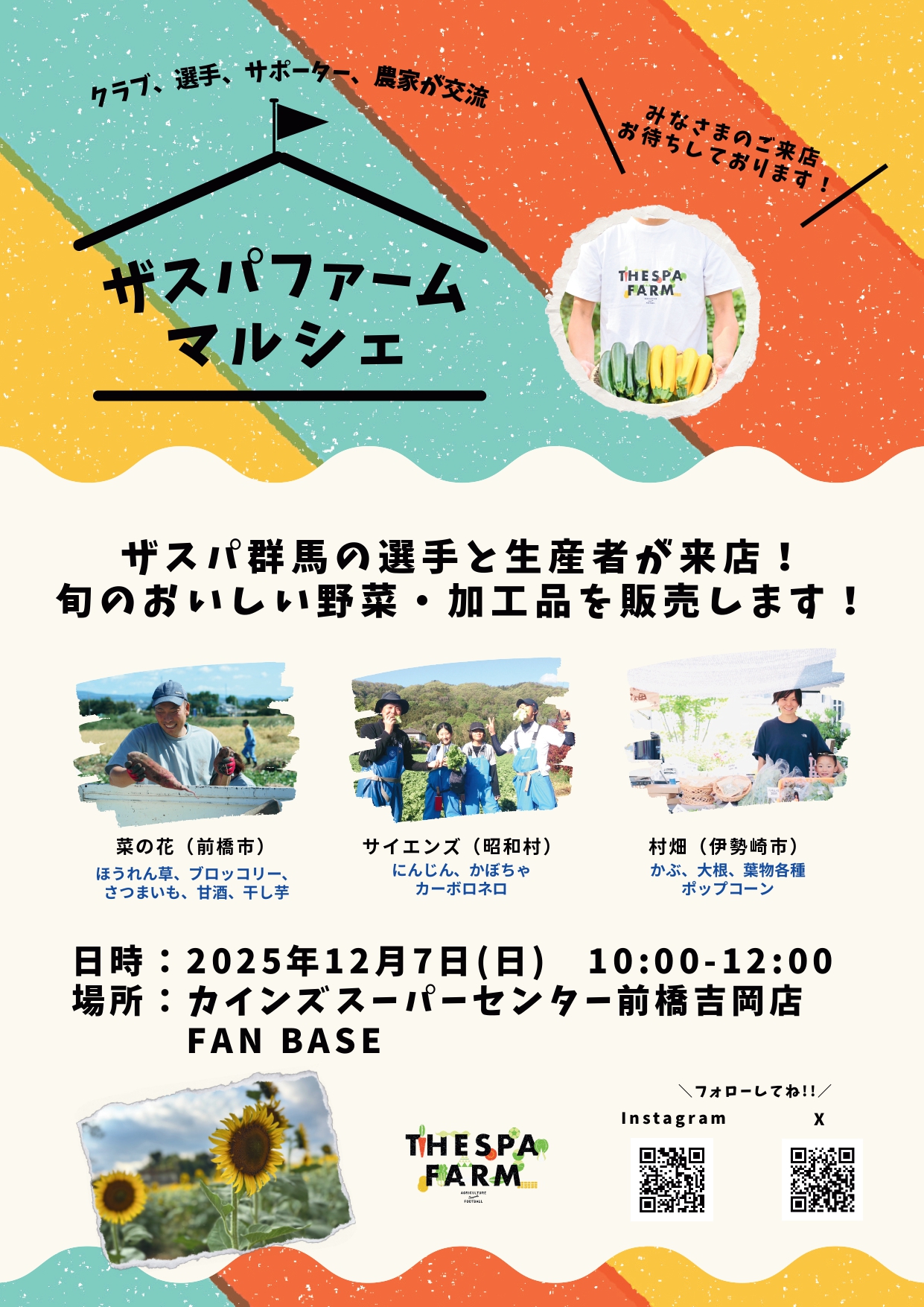 12月7日(日)に、カインズスーパーセンター前橋吉岡店 FANBASEにて、ザスパファームマルシェを開催いたします。群馬県内のザスパファーム登録農園の皆様が集まり、野菜や加工品を販売。当日は、ザスパファームの参加選手も来場予定です。たくさんの皆様のご来場をお待ちしております!