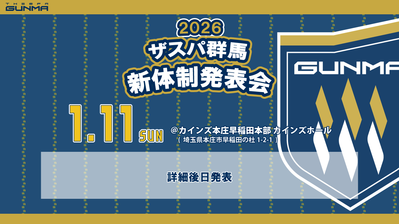 この度、2026年1月11日(日)に「2026ザスパ群馬 新体制発表会」をカインズ本庄早稲田本部カインズホールにて開催することとなりましたので、お知らせいたします。当日は、新加入選手の紹介のほか、全選手が参加し選手トークショーやユニフォームのお披露目などを予定しており、報道のみならずファン・サポーターの皆様もお楽しみいただける内容となっております。詳細は決まり次第お知らせいたします。