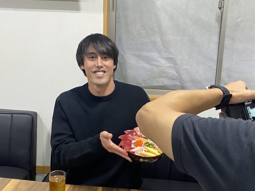 2025年発行分としては最後となる12月26日(金)発行号には、青木翔大選手が登場します。訪れたのは、地元の人たちで連日大盛況で、予約が取りづらいことでも知られる名店。近くを通るたびに気になっていた青木選手がある日、暖簾をくぐってみたところ、一切れ一切れが肉厚でボリューミー、そして新鮮な魚介類に、その日からお店の大ファンになったそうです。