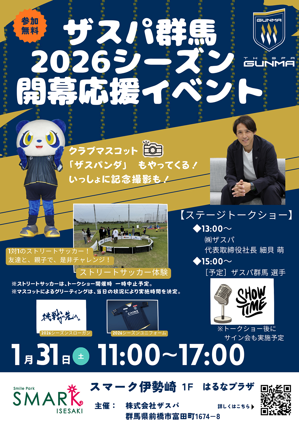 このたびザスパ群馬では、明治安田J2・J3百年構想リーグの開幕に向けて、スマーク伊勢崎にて下記のとおり「開幕告知&応援イベント」を実施致します。なお、ステージトークショーに出演する選手は決まり次第、お知らせいたします。皆さまのご来場お待ちしております。