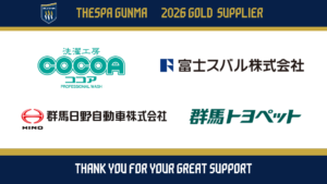 このたび、ザスパ群馬では2026シーズンゴールドサプライヤーとして「 有限会社ココア」様、「富士スバル株式会社」様、「群馬日野自動車株式会社」様、「群馬トヨペット株式会社」様にご支援をいただくことになりましたので、お知らせいたします。