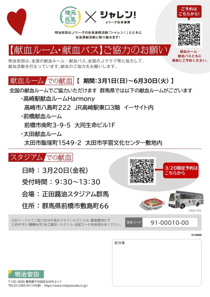 ザスパ群馬では3月20日(金祝)に開催する明治安田J2・J3百年構想リーグ 地域リーグラウンド EAST-Aグループ 第7節 湘南ベルマーレ戦 明治安田スペシャルマッチにおいて、明治安田生命保険相互会社 群馬支社様、および日本赤十字社 群馬県赤十字血液センター様と協力いたしまして、「シャレン!で献血」を実施いたしますので、お知らせいたします。