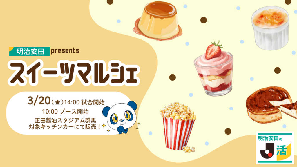 Jリーグと明治安田の共同プロジェクト「明治安田のJ活」の取り組みの一環として、スタジアムでスイーツを楽しめる『明治安田 presents スイーツマルシェ』を開催いたします。