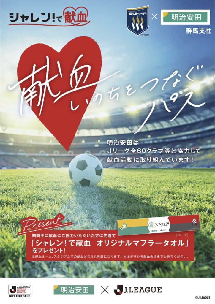 明治安田生命保険相互会社 群馬支社様、および日本赤十字社 群馬県赤十字血液センター様と協力いたしまして、「シャレン!で献血」を今シーズンのスペシャルマッチでも実施いたします。献血にご協力いただいた50名様に、「Jリーグオリジナルマフラータオル」をプレゼントいたします。ぜひご協力いただけますよう、お願いいたします!