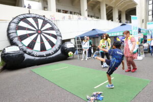 オリジナルベースボールシャツの抽選会や大人気アトラクション「キックダーツ」もこちらのブースで開催いたします! お気軽にお立ち寄りください。
