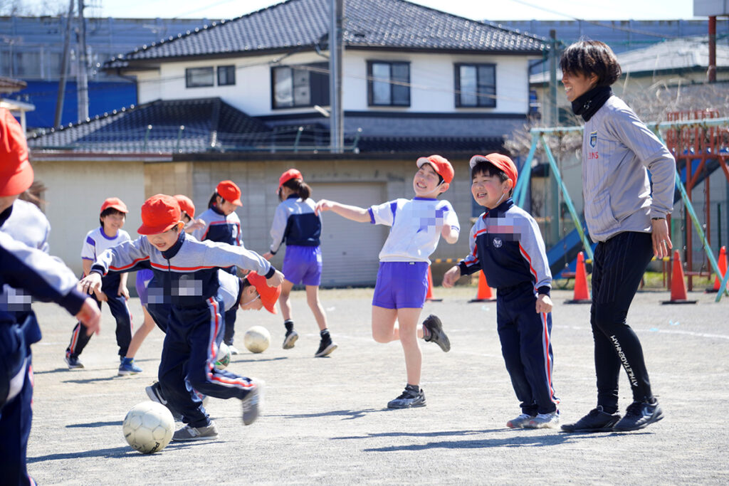 またスマイルキッズキャラバン(サッカー教室)では、ボールを使って体を動かす楽しさを感じてもらいながら、慣れてきたところでチーム対抗戦も実施。校庭には子どもたちの笑い声が響き渡りました。ここでも校長先生チームが優勝! 子どもたちと一緒に笑顔あふれる時間となりました。