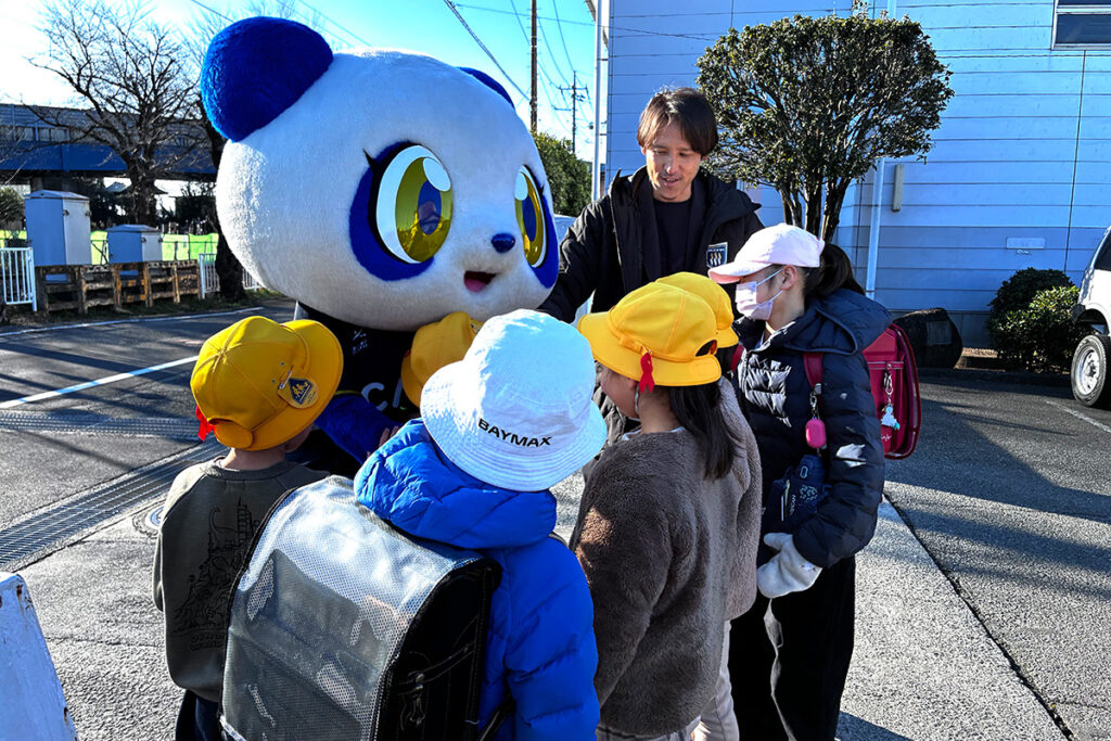 朝のあいさつ運動にはザスパンダも参加。登校してくる子どもたちはザスパンダを見つけると笑顔で近づき、元気いっぱいにあいさつをしてくれました。途中には海外の方に道を尋ねられる場面もあり、細貝社長が通訳をするという思わぬハプニングも。朝から和やかな雰囲気の時間となりました。