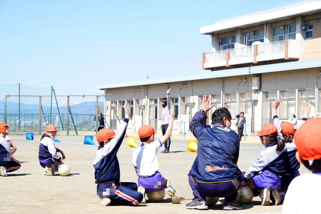 またスマイルキッズキャラバン(サッカー教室)では、ボールを使って体を動かす楽しさを感じてもらいながら、慣れてきたところでチーム対抗戦も実施。校庭には子どもたちの笑い声が響き渡りました。ここでも校長先生チームが優勝! 子どもたちと一緒に笑顔あふれる時間となりました。