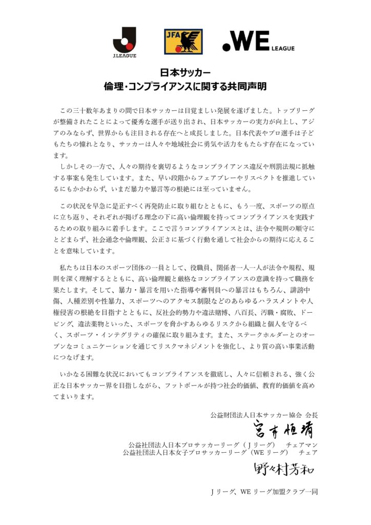 CLUB 2026.03.29 日本サッカー倫理コンプライアンス声明共同発表について 本日、日本サッカー協会(JFA)より「日本サッカー 倫理・コンプライアンスに関する共同声明」が出されました。 同声明はサッカー界全体でスポーツの原点に立ち返り、コンプライアンス重視の組織基盤を構築し、関係者全員が高い倫理観を持って行動する姿勢を示す内容となります。 日本サッカー界の信頼回復と持続的な発展に向けてJリーグ、Jリーグ60クラブも本声明に賛同し主体的に取り組み、倫理・コンプライアンスの強化に取り組んでまいります。