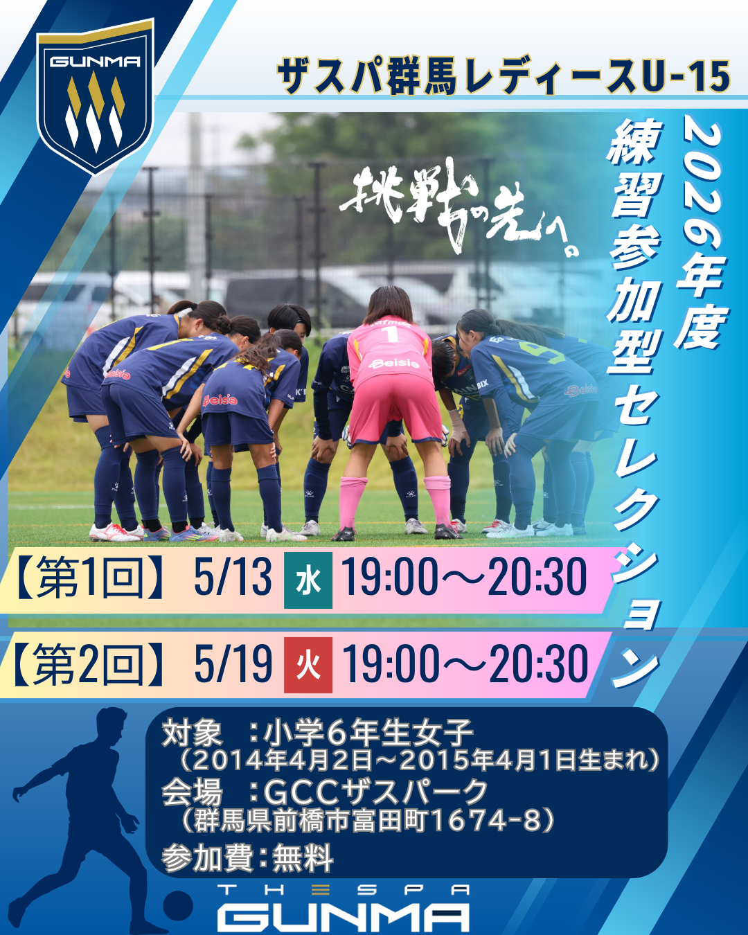 このたび、ザスパ群馬レディースU-15では、小学6年生の女子を対象とした練習参加型セレクションを開催いたします。