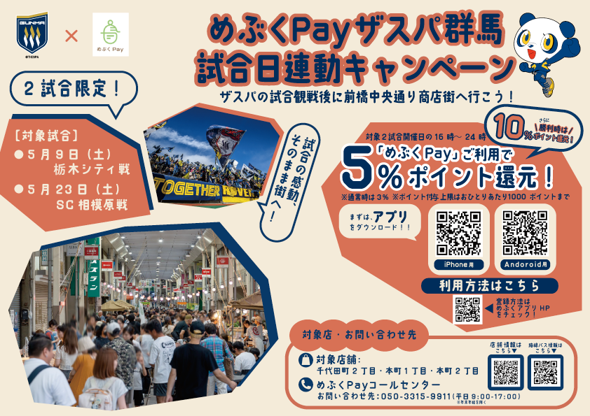 株式会社ザスパとめぶくグラウンド株式会社は、2026年5月のホームゲーム2試合を対象に、「めぶくPay」ご利用者を対象としたポイント還元キャンペーンを実施いたします。本キャンペーンは、ザスパ群馬の試合結果に応じてポイント還元率が変動する、ファン・サポーター参加型の企画です。